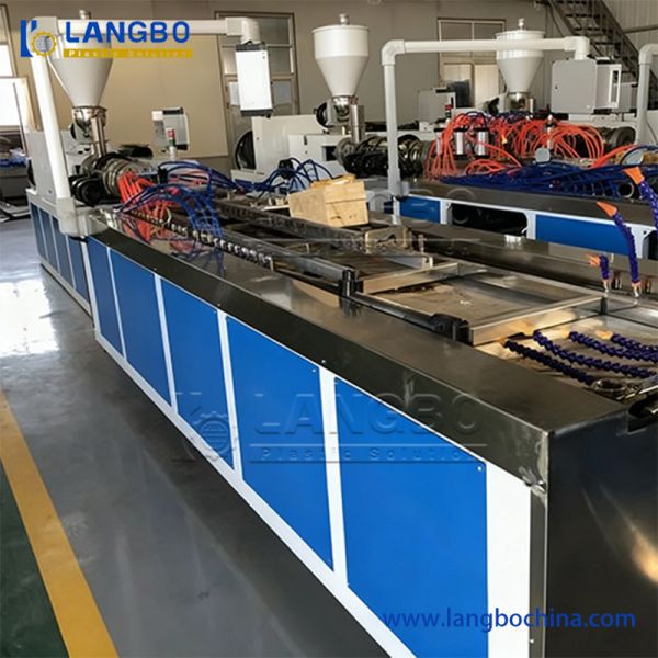 This PVC profile extrusion line adopts conical twin screw extruder, which is suitable for both PVC powder and PVC granules. It has degassing system to ensure the excellent material plasticization. The high speed mould is available, and it can largely increase the productivity.